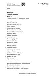 E LK HT 1 (W1) Seite 3 von 6 Name: _______________________ Klausurteil A Osayande Igbinedion AFRICA Osayande Igbinedion is a male poet from Nigeria. Africa, my Africa, Africa my motherland, Africa the land of the black race, Torn in a conflict 5 Africa of high and low lands, Africa of thick forest and shrubs, Africa in which abound many rivers, And natural wealth Bountiful and splendid 10 Africa, my Africa, A race struggling within For a place in the sky; Wither do you go now? When the white race 15 Had lunged upon you A cloud overshadowed you, In a wave of cultures Like the mighty roars of the Atlantic Across the beaches of Lagos. 20 You were torn apart, Body and soul, In bits of disgusting rags… When believers and ministers of imported religions Go back to their African roots 25 You are an edifice of tattered cloths When teachers and students of white knowledge Abiturprüfung 2021 – Nur für den Dienstgebrauch!