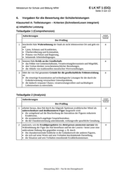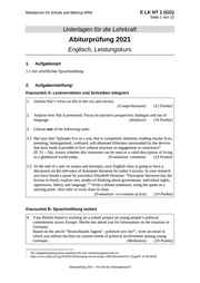 Ministerium für Schule und Bildung NRW E LK NT 1 (GG) Seite 1 von 13 Unterlagen für die Lehrkraft Abiturprüfung 2021 Englisch, Leistungskurs 1. Aufgabenart 1.1 mit schriftlicher Sprachmittlung 2. Aufgabenstellung 1 Klausurteil A: Leseverstehen und Schreiben integriert 1. Outline Hal’s views on life in the city and society. (Comprehension) (12 Punkte) 2. Analyse how Hal is presented. Focus on narrative perspective, dialogue and use of language. (Analysis) (16 Punkte) 3. Choose one of the following tasks: 3.1 Hal says that “[p]eople live in a way that is completely inhuman, leading insular lives, preening, homogenised, confused, self-obsessed illiterates surrounded by the devices that have made it possible to live without structure or engagement or conscience” (ll. 51 – 54). Assess whether this statement can be seen as a valid description of living in a globalised world today. (Evaluation: comment) (14 Punkte) 3.2 At the end of a unit on utopia and dystopia, your English class is going to have a discussion on the relevance of dystopian literature for today’s society. In your research you have found a quote by journalist Elizabeth Neoman: “Dystopian literature has the license to freely explore new modes of thinking about government, individual rights, 2 oppression, liberty and language.” Write a debate statement, using the quote as a starting point. Also refer to work done in class. (Evaluation: re-creation of text) (14 Punkte) Klausurteil B: Sprachmittlung isoliert 4. Your British friend is working on a school project on young people’s political commitment across Europe. She/he has asked you for information on the situation in Germany. Based on the article “Deutschlands Jugend – politisch wie nie?”, write an email in which you inform her/him on current trends of political involvement among young Germans. (Mediation) (18 Punkte) 1 Die Aufgabenstellung deckt inhaltlich alle drei Anforderungsbereiche ab. 2 https://www.dailycal.org/2018/03/18/dystopian-novels-today-1984-fahrenheit451/ (Zugriff: 31.08.2020) Abiturprüfung 2021 – Nur für den Dienstgebrauch!