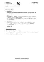 E LK NT 1 (GG) Seite 2 von 7 Name: _______________________ Materialgrundlage: • Klausurteil A: Robert Ford, The King of Spain, Malmesbury: Apostrophe Books 2014, S. 96 – 98 Wortzahl: 983 Zitat: Elizabeth Neoman, “In the era of Trump, dystopian literature makes a comeback”, in: The Daily Californian, 18 March 2018 https://www.dailycal.org/2018/03/18/dystopian-novels-today-1984-fahrenheit451/ (Zugriff: 31.08.2020) • Klausurteil B: Lisa Hänel, „Deutschlands Jugend – politisch wie nie?‘‘, in: DW, 7. Juni 2019 https://www.dw.com/de/deutschlands-jugend-politisch-wie-nie/a-49085767 (Zugriff: 31.08.2020) Wortzahl: 594 Zugelassene Hilfsmittel: • Ein- und zweisprachiges Wörterbuch • Herkunftssprachliches Wörterbuch für Schülerinnen und Schüler, deren Herkunftssprache nicht Deutsch ist • Wörterbuch zur deutschen Rechtschreibung Abiturprüfung 2021 – Nur für den Dienstgebrauch!