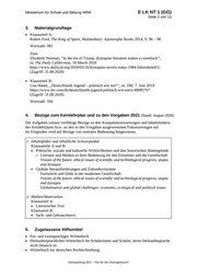Ministerium für Schule und Bildung NRW E LK NT 1 (GG) Seite 2 von 13 3. Materialgrundlage • Klausurteil A: Robert Ford, The King of Spain, Malmesbury: Apostrophe Books 2014, S. 96 – 98 Wortzahl: 983 Zitat: Elizabeth Neoman, “In the era of Trump, dystopian literature makes a comeback”, in: The Daily Californian, 18 March 2018 https://www.dailycal.org/2018/03/18/dystopian-novels-today-1984-fahrenheit451/ (Zugriff: 31.08.2020) • Klausurteil B: Lisa Hänel, „Deutschlands Jugend – politisch wie nie?‘‘, in: DW, 7. Juni 2019 https://www.dw.com/de/deutschlands-jugend-politisch-wie-nie/a-49085767 (Zugriff: 31.08.2020) Wortzahl: 594 4. Bezüge zum Kernlehrplan und zu den Vorgaben 2021 (Stand: August 2020) Die Aufgaben weisen vielfältige Bezüge zu den Kompetenzerwartungen und Inhaltsfeldern des Kernlehrplans bzw. zu den in den Vorgaben ausgewiesenen Fokussierungen auf. Im Folgenden wird auf Bezüge von zentraler Bedeutung hingewiesen. 1. Inhaltsfelder und inhaltliche Schwerpunkte Klausurteile A und B: • Politische, soziale und kulturelle Wirklichkeiten und ihre historischen Hintergründe – Literatur und Medien in ihrer Bedeutung für den Einzelnen und die Gesellschaft Visions of the future: ethical issues of scientific and technological progress; utopia and dystopia • Globale Herausforderungen und Zukunftsvisionen Fortschritt und Ethik in der modernen Gesellschaft Visions of the future: ethical issues of scientific and technological progress; utopia and dystopia Globalisation and global challenges: economic, ecological and political issues 2. Medien/Materialien Klausurteil A: • Literarischer Text Klausurteil B: • Sach- und Gebrauchstext 5. Zugelassene Hilfsmittel • Ein- und zweisprachiges Wörterbuch • Herkunftssprachliches Wörterbuch für Schülerinnen und Schüler, deren Herkunftssprache nicht Deutsch ist • Wörterbuch zur deutschen Rechtschreibung Abiturprüfung 2021 – Nur für den Dienstgebrauch!