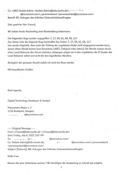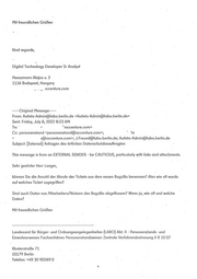 Nickel, Susanne Von: < ■ '-'a)accenture.com> Gesendet: Montag, 11. Juli 2022 11:16 „ An: Cc: LABO Autista-Admin; Langer, Uwe; Personenstand Betreff: RE; Anfragen des örtlichen Datenschutzbeauftragten Hallo Herr Freund, Vielen Dank für Ihre Email. . . . Ich habe diesbezüglich bei dem Team nachgefragf, und habe die Rückmeldung bekommen, dass es aus deren Sicht machbar wäre. . Ich melde mich bei Ihnen sobald mir weitere Updates oder das Ergebnis mitgeteilt wurde. Mit freundlichen Grüßen Kind regards, . _ I I I yoo Digital Technology Developer Sr Analyst Hauszmann Alajos u. 2 1116 Budapest, Hungary r @accenture.com ...... Original Message....... From: J.Freund@ldbo.berlin.de <J.Freund@labo.berlin.de> Sent: Monday, July 11, 2022 10:56 AM To: < ;@accenture.com> Cc: Autista-Admin@labo.berlin.de; /e < ‘ ~r@accenture.com>; Personenstand <personenstand@accenture.com> ’ Subject; [External] AW: Anfragen des örtlichen Datenschutzbeauftragten Hallo Frau'' vielen Dank für Ihre Rückmeldung. i