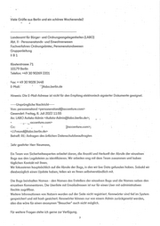 1 Viele Grüße aus Berlin und ein schönes Wochenende2 Landesamt für Bürger- und Ordnungsangelegenheiten (LABO) Abt. II - Personenstands- und Einwohnerwesen Fachverfahren Ordnungsämter, Personenstandswesen Gruppenleitung II B 1 Klosterstrasse 71 .. 10179 Berlin , Telefon:+49 30 90269 2201 Fax: + 49 30 9028 3448 . E-Mail: ’ ' ‘TJlabo.berlin.de Hinweis: Die E-Mail-Adresse ist nicht für den Empfang elektronisch signierter Dokumente geeignet. ...... Ursprüngliche Nachricht....... Von: Personenstand <personenstand@accenture.com> . Gesendet: Freitag, 8. Juli 2022 11:55 . An: LABO Autista-Admin <Autista-Admin@labo.berlin.de>; „ , < __ ^jaccenture.corn> . Cc: , , ; a)accenture.com>; <J.Freund@labo.berlin.de> Betreff: RE: Anfragen des örtlichen Datenschutzbeauftragten . Sehr geehrter Herr Neumann, Ein Team von Sicherheitsexperten arbeitet daran, die Anzahl und Herkunft der Abrufe der einzelnen Bugs aus den Logdateien zu identifizieren. Wir arbeiten eng mit dem Team zusammen und haben täglichen Kontakt mit ihnen. Wir fokussieren hauptsächlich auf die Abrufe der Bugs, in den wir live Data gefunden haben. Sobald wir diesbezüglich einen Update haben, teilen wir es Ihnen selbstverständlich mit. Die Bugs beinhalten Namen - den Namen des Erstellen der einzelnen Bugs und die Namen neben den einzelnen Kommentaren. Die Userliste mit Emailadressen ist nur für einen User mit administrativen Rechte zugriffbar. Weitere Informationen von Nutzern wurden auf der Seite nicht registriert. Kennwörter sind tief im System gespeichert und mit hash gesichert. Kennwörter können nur von einem Admin zurückgesetzt werden, also das wäre für einen anonymen "Besucher" auch nicht möglich. Für weitere Fragen stehe ich gerne zur Verfügung. 3