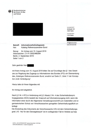 Berlin, 02.09.2019 Seite 2 von 2 Staatswohl erforderlich. Nach 8 2 Absatz 2 Nr. 4 der Allgemeinen Verwaltungsvor- schrift zum materiellen und organisatorischen Schutz von Verschlusssachen (Ver- schlusssachenanweisung - VSA) sind Informationen, deren Kenntnisnahme durch Unbefugte für die Interessen der Bundesrepublik Deutschland oder eines ihrer Län- der nachteilig sein könnte, entsprechend einzustufen. Die Kenntnis der Referenzsze- narien des Bundesfür Fallkonstellationen auf dem Gebiet der Zivilen Verteidigung könnte potentiellen Tätern ermöglichen, sich auf etwaige Gefahrenabwehrmaßnah- men einzustellen und ein Anschlagsszenario so zu planen, dass die gewünschten Auswirkungen zum Schaden der Bundesrepublik Deutschland oder einesihrer Län- der eintreten. Die Zusammenstellung der Titel („Katalog“) würde Schwerpunkte für Abwehrmaßnahmen und damit die strategische Planung der Bundesrepublik zum Nachteil des Staatswohls offenlegen. Ich bedauere, Ihnen keine andere Auskunft geben zu können. Rechtsbehelfsbelehrung: Gegendiesen Bescheid kann innerhalb eines Monats nach Bekanntgabe Widerspruch beim Bundes- ministerium des Innern, für Bau und Heimat (BMI), erhoben werden. Der Widerspruch kann schriftlich oder zur Niederschrift beim Bundesministerium des Innern, für Bau und Heimat, Alt-Moabit 140 in 10557 Berlin, oder elektronisch 1. mit einer qualifizierten elektronischen Signatur versehen durch E-Mail, an die E-Mail-Adresse Poststelle@bmi.bund.de, oder 2. durch eine De-Mail mit der Versandart nach $ 5 Absatz 5 des De-Mail-Gesetzes an die De-Mail-Adresse Poststelle@bmi-bund.de-mail.de erklärt werden. Hinweis zum Datenschutz Bei der Bearbeitung wurden bzw. werden von Ihnen personenbezogene Daten verarbeitet. Welche Daten zu welchem Zweck und auf welcher Grundlage verarbeitet werden, ist abhängig von Ihrem Anliegen und den konkreten Umständen. Weitere Informationen hierzu und über Ihre Be- troffenenrechte finden Sie in der Datenschutzerklärung https://www.bmi.bund.de/DE/service/daten- schutz/datenschutz node.html des Bundesministeriums des Innern, für Bau und Heimat.