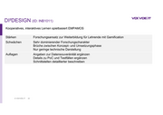 DI²DESIGN (ID: INB1011) Kooperatives, interaktives Lernen spielbasiert EMPAMOS Stärken Forschungsansatz zur Weiterbildung für Lehrende mit Gamification Schwächen Sehr dominierender Forschungscharakter Brüche zwischen Konzept- und Umsetzungsphase Nur geringe technische Darstellung Auflagen Angaben zur Datensouveränität ergänzen Details zu PoC und Testfällen ergänzen Schnittstellen detaillierter beschreiben © VDI/VDE-IT 32