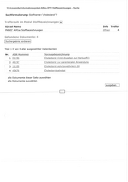 10 ArzneimitteI-lnformationssystem AMlce-ÖFF/ Stoffbezeichnungen — Suche Suchform ulierung: Stoffname: "cholesterol"? Trefferzahl im Modul Stoffbezeichnungen E] Kürzel Name Info Treffer PNBEZ AMIce Stoffbezeichnungen öffnen 4 Gefundene Dokumente: 4 lguchergebnis sortieren] Titel 1-4 von 4 aller ausgewählter Datenbanken Nr. ASK-Nummer flllzggsbezeichnung 1, 0_1_1_9_4 Cholesteroi (Lngiigapgn zur Herkunftn 2. i6_1_9_7_ Cholesterol zur oarenteralen Anwenduno 3. 11109 CholesterohooIv(oxvethvlen)-24 4. 5.6.26 Cmzleslirxdnelmim alle Dokumente dieser Seite auswählen alle Dokumente auswählen ausgeben