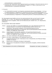11 Arzneimittel-Informationssystem AMlce-ÖFF/ Stoffbezeichnungen —- Erläuterungen Vor der Recherche nehmen Sie bitte die folgenden Erläuterungen zur Kenntnis Benutzungshinweise zur Datenbank mit den ‘Rechtsverbindlichen Stoffbezeichnungen gemäß 5 10 Abs. 6 Nr. 1 AMG‘ (Stoffbezeichnungen) für die Bestandteile von Fertigarzneimitteln (Synonym- und Verweisregister) Für einen Stoff können grundsätzlich 3 Bezeichnungen angegeben sein, die entsprechend mit einer der aufgeführten Ziffern gekennzeichnet sind: 1. Eine Bezeichnung der World Health Organization (WHO), ‘International Nonproprietary Names for Pharmaceutical Substances (INN)', oder eine davon abgeleitete Bezeichnung. (Als aktuelle Definition des INN gilt die nachstehende systematische wissenschaftliche Bezeichnung.) 2. Eine systematische wissenschaftliche Bezeichnung, bei chemisch definierten Stoffen die systematische chemische Bezeichnung nach den aktuellen Regeln der ‘International Union of Pure and Applied Chemistry (IUPAC)'. 3. Eine gebräuchliche (wissenschaftliche) Kurzbezeichnung (Trivialname) oder eine weitere systematische wissenschaftliche Bezeichnung oder der Titel einer Monographie im Deutschen Arzneibuch oder im Europäischen Arzneibuch. Sind für Stoffe Bezeichnungen mit der Kennung 1., 2. oder 3. nicht vorhanden, steht an den dafür vorgesehenen Stellen ein Querstrich '?'. In speziellen Fällen kann eine Bezeichnung noch mit einer nachfolgenden Bemerkung zur Erklärung von Sachverhalten oder über die Handhabung der Bezeichnung versehen sein [in doppelte runde Klammern eingeschlossen]. Die INN haben Priorität bei der Bezeichnung der Bestandteile von Fertigarzneimitteln. Für einen Stoff, für den kein INN vorliegt, kann zur Bezeichnung der Bestandteile von Fertigarzneimitteln alternativ sowohl die systematische wissenschaftliche Bezeichnung (siehe oben unter 2.) als auch eine weitere wissenschaftliche Bezeichnung (siehe oben unter 3.) benutzt werden. Bei Stoffen, die in Monographien des Europäischen Arzneibuches beschrieben sind, ist entsprechend den Richtlinien 75/318/EWG (Humanarzneimittel) und 81/852/EWG (Tierarzneimittel) der Monographietitel als Bezeichnung zu benutzen. Falls ein Monographietitel jedoch von der regelgerechten Bezeichnung abweicht, wird er um die Quellenangabe (Ph.Eur.) ergänzt. Der Zusatz 'Ph.Eur.' gehört zur Bezeichnung im Sinne der Zw miRechtsverbindlichen Stoffbezeichnungen. gemäß ä 10 Abs. 6 Nr. 1 AMG‘! Beispiele: o Acetylsalicylsäure (Ph.Eur.) o Sorbitol (Ph.Eur.) Für eine Reihe von Stoffen sind noch weitere gebräuchliche Bezeichnungen, die aber nicht zur Bezeichnung der Bestandteile von Fertigarzneimitteln verwendet werden dürfen, weil sie den genannten Vorgaben nicht genügen, nicht mehr den aktuellen Nomenklaturregeln entsprechen, inkorrekt sind, nic‘ '* eindeutig den Stoff beschreiben oder Warennamen (oder Teile davon) darstellen, als Synonyme aufgeführt. Die Schreibung der Bezeichnungen erfolgt grundsätzlich nach DUDEN oder fachspezifischen Regeln. Die Worttrennung am Zeilenende wird durch einen Doppelstrich (=) angezeigt. Steht am Zeilenende ein Bindestrich (-), so gilt er zugleich als Trennungszeichen. Die Salze von chemischen Verbindungen werden so bezeichnet, dass die Namen der Grundsubstanzen weitgehend erhalten bleiben und damit genealogische Zusammenhänge nicht verdeckt werden. In Anlehnung an traditionelle Methoden der Benennung von Salzen organischer Basen erhalten die Salze von Halogenwasserstoffsäuren den unveränderten Namen der Base und die Endung hydrofluorid‘, ' ‘ hydrochlorid‘, hydrobromid‘ bzw. hydroiodid‘ (im Bedarfsfalle mit einer Multiplikativzahl). Bei den ' ' anderen Salzen folgen dem unveränderten Namen der Base der Name des Anions und eine Angabe zum Molverhältnis der Komponenten. Beispiele: 1.0xytetracycIin o Die systematische Bezeichnung für 'Oxytetracyclin' lautet: (4S,4aR,5S,5aR,6S,12aS)-4- Dimethylamino-3,5,6,10,12,12a-hexahydroxy-6-methyl-1,11- dioxo-1‚4,4a,5,5a,6,11,12a- octahydrotetracen-2-carboxamid o Für das 'Hydrochlorid' lautet die systematische Bezeichnung: (1S,4aS‚11S‚11aR,12S,12aR)-3- Carbamoyl-2,4a,5,7,11,12-hexahydroxy-N‚N‚11-trimethyI-4‚6-dioxo-1,4,4a,6,11,11a,12,12a-