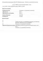12 Arzneimittel-lnformationssystem AMIce-ÖFF/ Stoffbezeichnungen - Cholesterol zur parenteralen Anwendung zurgckl Blättern in der Dokumentausgabe Iwgitgr 2 von 4 BfArM: AMIce Stoffbezeichnungen (PNBEZ) © BfArM Allgemeine Angaben Stoffbezeichnung Cholesterol zur parenteralen Anwendung ASK-Nummer 46197 ASK-Nummer mit Prüfziffer 46197-7 Relative Molmasse 386.6535 Bruttoformel C27H46O Bezeichnungen 2. Cholest-5-en-3ß-ol‚ zur parenteralen Anwendung, aus Wollwachs gewonnen, Gehalt 99.0—101‚0 % Cholesterol 3. Cholesterol zur parenteralen Anwendung Überschrift Synonymverweise statt folgender Bezeichnung benutze die Bezeichnungen unter 2. oder 3. Cholesterin zur parenteralen Anwendung