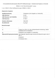 13 Arzneimittel-Informationssystem AMIce-ÖFF/ Stoffbezeichnungen — Cholesteroi ((mit Angaben zur Herkunft)) Blättern in der Dokumentausgabe I weiter 1 von 4 BfArM: AMIce Stoffbezeichnungen (PNBEZ) © BfArM Allgemeine Angaben Stoffbezeichnung Cholesterol ((mit Angaben zur Herkunft)) ASK-Nummer 01194 ASK-Nummer mit Prüfziffer 01194-0 CAS-Nummer 57-88-5 Relative Molmasse 386.6535 Bruttoformel C27H45O Bezeichnungen I a 2. ChoIest-5-en-3ß-oI, für die nichtparenterale Anwendung, Gehalt mindestens 95 % Cholesteroi 3. Cholesterol ((mit Angaben zur Herkunft)) Überschrift Synonymverweise statt folgender Bezeichnungen benutze die Bezeichnungen unter 2. oder 3. Cholesterin ÜS-Cholestenßß-oi