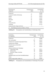 Bewertungsverfahren BVWP 2003 Teil II: Bewertungskomponenten der NKA Beschreibung der Nutzungszeitraum Annuitätenfaktor Anlagenteile (Jahre) (p = 3%) Grunderwerb ∞ 0,03000 Untergrund, Unterbau, Entwässerung 90 0,03226 Oberbau 25 0,05743 Brücken 50 0,03887 Stützwände 50 0,03887 Tunnel 50 0,03887 Sonstige Bauwerke 50 0,03887 Ausstattung 10 0,11723 Sonstige besondere Anlagen und Kosten ** --- ** Nach Erfahrung anzusetzen; im Mittel ca. 20 Jahre Abbildung 30: Nutzungsdauern und Annuitätenfaktoren Verkehrsträger Straße Beschreibung Nutzungszeitraum Annuitätenfaktor der Anlagenteile (Jahre) (p = 3%) Grunderwerb ∞ 0,03000 Fluss- und Kanalbett 100 0,03165 Uferdeckwerke in geregelten/staugeregelten Flüssen 40 0,04326 Uferdeckwerke in Kanälen 35 0,04654 Ufereinfassungen aus Beton/Stahl 75 0,03367 Kanalbrücken 75 0,03367 Schleusen und Hebewerke, Wehranlagen • Tiefbau (Beton, Stahl) 80 0,03311 • Stahlwasserbau 40 0,04326 • Maschinen, Anlagen, Ausrüstung 30 0,05102 Hochbauten 50 0,03887 Schifffahrtszeichen (soweit keine Einzelfallbetrachtung) 10 0,11723 Dämme 80 0,03311 Sonstige Anlagen (Düker, Dalben etc.) 50 0,03887 Abbildung 31: Nutzungsdauern und Annuitätenfaktoren Verkehrsträger Wasserstraße 99