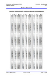 Ministerium für Bildung und Kultur Schriftliche Abiturprüfung Schleswig-Holstein 2012 Kernfach Mathematik Tabelle zur Normalverteilung, Werte der Gaußschen Integralfunktion ® Tea Se LT ISCH SEIT =TsHT °e] 1,51 | 0,0655 2,01 | 0,0222 2,51 .. 1,52 | 0,0643 a 2,02 | 0,0217 Bars 2,52 Es 0,9941 1,53 | 0,0630 | 0,9370 2,03 | 0,0212 | 0,9788 2,53 | 0,0057 | 0,9943 1,54 | 0,0618 | 0,9382 2,04 | 0,0207 | 0,9793 2,54 | 0,0055 | 0,9945 1,55 | 0,0606 | 0,9394 2,05 | 0,0202 | 0,9798 2,55 | 0,0054 | 0,9946 1,56 | 0,0594 | 0,9406 2,06 | 0,0197 | 0,9803 2,56 | 0,0052 | 0,9948 1,57 | 0,0582 | 0,9418 2,07 | 0,0192 | 0,9808 2,57 | 0,0051 | 0,9949 1,58 | 0,0571 | 0,9429 2,08 | 0,0188 | 0,9812 2,58 | 0,0049 | 0,9951 1,59 | 0,0559 | 0,9441 2,09 | 0,0183 | 0,9817 2,59 | 0,0048 | 0,9952 1,60 | 0,0548 | 0,9452 2,10 | 0,0179 | 0,9821 2,60 | 0,0047 | 0,9953 1,61 | 0,0537 | 0,9463 2,11 | 0,0174 | 0,9826 2,61 | 0,0045 | 0,9955 1,62 | 0,0526 | 0,9474 2,12 | 0,0170 | 0,9830 2,62 | 0,0044 | 0,9956 1,63 | 0,0516 | 0,9484 2,13 | 0,0166 | 0,9834 2,63 | 0,0043 | 0,9957 1,64 | 0,0505 | 0,9495 2,14 | 0,0162 | 0,9838 2,64 | 0,0041 | 0,9959 1,65 | 0,0495 | 0,9505 2,15 | 0,0158 | 0,9842 2,65 | 0,0040 | 0,9960 1,66 | 0,0485 | 0,9515 2,16 | 0,0154 | 0,9846 2,66 | 0,0039 | 0,9961 1,67 | 0,0475 | 0,9525 2,17 | 0,0150 | 0,9850 2,67 | 0,0038 | 0,9962 1,68 | 0,0465 | 0,9535 2,18 | 0,0146 | 0,9854 2,68 | 0,0037 | 0,9963 1,69 | 0,0455 | 0,9545 2,19 | 0,0143 | 0,9857 2,69 | 0,0036 | 0,9964 1,70 | 0,0446 | 0,9554 2,20 | 0,0139 | 0,9861 2,70 | 0,0035 | 0,9965 1,71 | 0,0436 | 0,9564 2,21 | 0,0136 | 0,9864 2,71 | 0,0034 | 0,9966 1,72 | 0,0427 | 0,9573 2,22 | 0,0132 | 0,9868 2,72 | 0,0033 | 0,9967 1,73 | 0,0418 | 0,9582 2,23 | 0,0129 | 0,9871 2,73 | 0,0032 | 0,9968 1,74 | 0,0409 | 0,9591 2,24 | 0,0125 | 0,9875 2,74 | 0,0031 | 0,9969 1,75 | 0,0401 | 0,9599 2,25 | 0,0122 | 0,9878 2,75 | 0,0030 | 0,9970 1,76 | 0,0392 | 0,9608 2,26 | 0,0119 | 0,9881 2,76 | 0,0029 | 0,9971 1,77 | 0,0384 | 0,9616 2,27 | 0,0116 | 0,9884 2,77 | 0,0028 | 0,9972 1,78 | 0,0375 | 0,9625 2,28 | 0,0113 | 0,9887 2,78 | 0,0027 | 0,9973 1,79 | 0,0367 | 0,9633 2,29 | 0,0110 | 0,9890 2,79 | 0,0026 | 0,9974 1,80 | 0,0359 | 0,9641 2,30 | 0,0107 | 0,9893 2,80 | 0,0026 | 0,9974 1,81 | 0,0351 | 0,9649 2,31 | 0,0104 | 0,9896 2,81 | 0,0025 | 0,9975 1,82 | 0,0344 | 0,9656 2,32 | 0,0102 | 0,9898 2,82 | 0,0024 | 0,9976 1,83 | 0,0336 | 0,9664 2,33 | 0,0099 | 0,9901 2,83 | 0,0023 | 0,9977 1,84 | 0,0329 | 0,9671 2,34 | 0,0096 | 0,9904 2,84 | 0,0023 | 0,9977 1,85 | 0,0322 | 0,9678 2,35 | 0,0094 | 0,9906 2,85 | 0,0022 | 0,9978 1,86 | 0,0314 | 0,9686 2,36 | 0,0091 | 0,9909 2,86 | 0,0021 | 0,9979 1,87 | 0,0307 | 0,9693 2,37 | 0,0089 | 0,9911 2,87 | 0,0021 | 0,9979 1,88 | 0,0301 | 0,9699 2,38 | 0,0087 | 0,9913 2,88 | 0,0020 | 0,9980 1,89 | 0,0294 | 0,9706 2,39 | 0,0084 | 0,9916 2,89 | 0,0019 | 0,9981 1,90 | 0,0287 | 0,9713 2,40 | 0,0082 | 0,9918 2,90 | 0,0019 | 0,9981 1,91 | 0,0281 | 0,9719 2,41 | 0,0080 | 0,9920 2,91 | 0,0018 | 0,9982 1,92 | 0,0274 | 0,9726 2,42 | 0,0078 | 0,9922 2,92 | 0,0018 | 0,9982 1,93 | 0,0268 | 0,9732 2,43 | 0,0075 | 0,9925 2,93 | 0,0017 | 0,9983 1,94 | 0,0262 | 0,9738 2,44 | 0,0073 | 0,9927 2,94 | 0,0016 | 0,9984 1,95 | 0,0256 | 0,9744 2,45 | 0,0071 | 0,9929 2,95 | 0,0016 | 0,9984 1,96 | 0,0250 | 0,9750 2,46 | 0,0069 | 0,9931 2,96 | 0,0015 | 0,9985 1,97 | 0,0244 | 0,9756 2,47 | 0,0068 | 0,9932 2,97 | 0,0015 | 0,9985 1,98 | 0,0239 | 0,9761 2,48 | 0,0066 | 0,9934 2,98 | 0,0014 | 0,9986 1,99 | 0,0233 | 0,9767 2,49 | 0,0064 | 0,9936 2,99 | 0,0014 | 0,9986 2,00 | 0,0228 | 0,9772 2,50 | 0,0062 | 0,9938 3,00 | 0,0013 | 0,9987 2012-M-H5-Stochastik-L nur für Lehrkräfte Seite 4 von 8