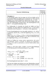 Ministerium für Bildung und Kultur Schriftliche Abiturprüfung Schleswig-Holstein 2012 Kernfach Mathematik Bewertung Erwartete Schülerleistung Zuordnung PM Teilaufgabe a) Aus den gegebenen Daten erhält man die folgende Vierfeldertafel mit rela- tiven Häufigkeiten (auf vier Nachkommastellen gerundet): A A G 0,1058 | 0,0450 | 0,1508 0,5820 | 0,2672 | 0,8492 il 0,6878 | 0,3122 Die gesuchte Wahrscheinlichkeit ist eine bedingte Wahrscheinlichkeit, die sich dann wie folgt berechnen lässt: P(ANG) _ 0,1058 Pa(@) = P(A) 0,6878 = 0,1538 = 15,38 % Teilaufgabe b) 190 000 - 0,54 - 0,85 = 87 210 87 210 Männer wurden im Jahr 2009 wegen eines Alkoholdelikts im Stra- Benverkehr verurteilt. X beschreibt die Anzahl der Männer unter den wegen Alkoholdelikten verur- teilten 50 Personen. Es handelt sich um eine binomialverteilte Zufallsgröße mit den Parametern n = 50, p = 0,85. Für die gesuchte Wahrscheinlichkeit folgt dann 50 P(X = 43) = (@ ) - 0,85 . 0,157 & 0,1575 = 15,75 %. X beschreibt jetzt die Anzahl der Männer unter den wegen Alkoholdelikten verurteilten 500 Personen. Mit n = 500, p = 0,85 folgt u = 500-0,85 = 425 und o? = 500 - 0,85 - 0,15 = 63,75 > 9. Die Laplace-Bedingung für die Näherung durch die Normalverteilung ist also erfüllt. P(X > 420) 1- PX <a) 1-8 419 40,5 — »>) 63,75 1- © (-0,69) = 1 — 0,2451 = 0,7549 = 75,49% 2012-M-H5-Stochastik-L nur für Lehrkräfte Seite 5 von 8