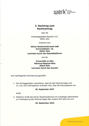 0 KOLNER STUDIERENDEN WERK 2. Nachtrag zum Pachtvertrag über die Kindertagesstätte Weyertal 113, 50931 Köln Zwischen dem Kölner Studierendenwerk AöR Universitätsstr. 16, 50937 Köln -vertreten durch den Geschäftsführer- und der Universität zu Köln Albertus-Magnus-Platz 50923 Köln -vertreten durch den Kanzler- wird nachfolgende Vereinbarung getroffen: 1. Die Vertragsparteien vereinbaren, dass 83 des Pachtvertrages vom 14. Juni 1972 dahingehend verändert wird, dass die Nutzungsdauer am 30. September 2027 endet. 2. Weiterhin erhält das Kölner Studierendenwerk ein einseitiges Optionsrecht zur Verlängerung des Pachtvertrages über weitere fünf Jahre bis zum 30. September 2032