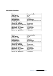 Mit Full-Disc-Encryption Name: Acer Aspire One 32-Bit / 64-Bit: 32- Bit Hardware-AES: nein Anzahl Kerne: DualCore Betriebsmodus: Höchstleistung Betriebssystem: Windows 7 Professional 32-Bit Full-Disc-Encryption: ein Starten von Windows: 30 Sekunden Herunterfahren von Windows: 18 Sekunden Starten von Firefox. 10 Sekunden Extrahieren von Eclipse: 200 Sekunden Starten von Eclipse: 40 Sekunden Starten von OpenOffice: 11 Sekunden Name: Acer Aspire One 32-Bit / 64-Bit: 32- Bit Hardware-AES: nein Anzahl Kerne: SingleCore Betriebsmodus: Höchstleistung Betriebssystem: Windows 7 Professional 32-Bit Full-Disc-Encryption: ein Starten von Windows: 37 Sekunden Herunterfahren von Windows: 13-15 Sekunden Starten von Firefox. 10 Sekunden Extrahieren von Eclipse: 260 Sekunden Starten von Eclipse: 35 Sekunden Starten von OpenOffice: 14 Sekunden Seite 93 von 107 | | 2010
