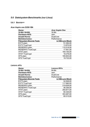 5.6 Dateisystem-Benchmarks (nur Linux) 5.6.1 Bonnie++ Acer Aspire one D250-1Bk Name: 32-Bit / 64-Bit: Hardware-AES: Anzahl Kerne: Betriebsmodus: Filesystem-Bonnie-Tests EXT3 plain EXT3 TrueCrypt REISERFS plain REISERFS TrueCrypt VFAT plain VFAT TrueCrypt XFS plain XFS TrueCrypt Acer Aspire One 32-Bit nein DualCore Performance in KB/s pro Block 51.284,00 13.870,00 110.516,00 17.951,00 164.150,00 18.278,00 165.603,00 19.722,00 Lenovo x61s Name: 32-Bit / 64-Bit: Hardware-AES: Anzahl Kerne: Betriebsmodus: Filesystem-Bonnie-Tests EXT3 plain EXT3 TrueCrypt REISERFS plain REISERFS TrueCrypt VFAT plain VFAT TrueCrypt XFS plain XFS TrueCrypt Lenovo X61s 64-Bit nein DualCore Performance in KB/s pro Block 44.948,00 117.680,00 219.636,00 56.294,00 293.877,00 60.320,00 353.467,00 60.510,00 Seite 98 von 107 | 2010