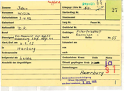 Hu vart Vornamen Henri Geburtsdatum 2 1 • 6 . 18 98 Geburtsort Ber lin Nationalität De utscher ){'xwt Na ehr . Er s . Aot . ) geprüft Zuname oienstgrad Gest. / Gef. in Kriegsgr. Liste Nr. 1 ') f' 1 _Jl~ ~2 ( 7 Sterbe-Reg. Nr. - - - -1- - - - - - - - -- - - Standesamt Sarg Nr. \{~?. \4~ Feuer Nr. ------------- Grabbrief Nr. Pcrt-sdanri-G-r-ab-la_g_e__,: ~i'i" · E ... h_r_e_n_f;;;-r---:i;-e- d --::-::-h- 0- .f- Funker am 13 • 6 • 1945 Bezirk Reihe Nr. Exhumiert am von Harnbur nach Todesu rsache - - ---- Leiche beigesetzt als Grabzeichen: Kreuz Stele Offentl. gepflegtes Grab ja /if~i Bemerkungen: ,/I. N .Fr. Bergedorf 91