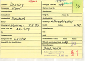 l....'ffu~ Zuname Vornamen Dö r r Karl Gu..s t av Krlegsgr. Liste Nr. Standesamt Geburtsort Sarg Nr. Dt . Feuer Nr. Grabbrief Nr. H Mili tär Grablage: Dienstgrad Shhütze Bezirk 2~- .1 2 .1 8 Exhumiert am ln von Todesursache nach belgesetzt als IieJ. c ne Anschrift der Angehörigen SG I Beruf Gest. / Gel. am 1 Sterbe·Reg. Nr. Geburtsdatum Nationalität et ""±8 d. , prd Reihe 351 Nr. -~ Grabzeichen: Kreuz Stele Platte t,~_, Öffentl. gepflegtes Grab ja/nein ~ Bemerkungen: Di ebs tei ch R uh e r echl<~nlsc-hodl111n, OJ fc.dj j V"m 'u I . ~....~~G .. IJ ~ .... / ~, ' w I