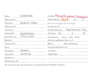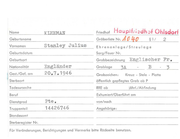 _N_ a_ m~ e __________K~LE~EMUlN __________ Geburtsname Vornamen Friedhof Hau p lfra ~dh ,:,f Chisdorf Gräberliste Nr. Stanley Julius lf 0 lfO Sarg/Feuer Nr. Geburtsort Grabbezeichnung Engländer ------------------ 1 Gest./Gef. am 20 . 7 • 19_ 4 _6 ____ I Sterbeort Grablage Grabzeichen: Englischer Fr • B 3A Kreuz - Stele - Platte öffentlich gepflegtes Grab ab P Todesursache RRE ab Beruf Exhumiert/Oberführt am Dienstgrad Truppenteil Pte . 14426746 2 Ehrenanlage/Streulage Geburtsdatum Nationalität §1 / jährl./ Abfindung von/nach Angehörige: Standesamt Sterberegister Nr. Für Veränderungen, Berichtigungen und Verm erke bitte Rückseite benutzen. 3
