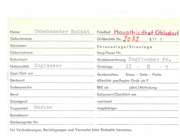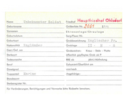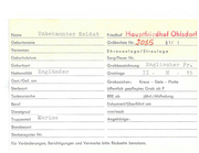 Name Unbekannter Soldat Friedhof Hau ptfri -~dhof Ohlsdorf Nr. J0$5 § 1/ 1 Geburtsname Gräberliste Vornamen Ehrenanlage/Streulage Geburtsdatum Sarg/Feuer Nr. Geburtsort Grabbezeichnung Nationalität Engländer Grabloge Engl i s eher Fr . II - H 15 Gest./Gef. om Grabzeichen: Sterbeort öffentlich gepflegtes Grab ab Todesursoche RRE ob Beruf Exhumiert/Oberführt am Dienstgrad von/noch Truppenteil Marine Kreuz - Stele - Platte P jährl./ Abfindung Angehörige: Standesamt Sterberegister Nr. Für Veränderungen, Berichtigungen und Vermerke bitte Rockseite benutzen.