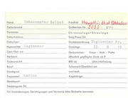 Unbekannter Soldat Geburtsname Hauptfr;cdhaf Obisdorf Gräberliste Nr. JO 8J. §l I 1 Vornamen Ehrenanlage/Streulage Geburtsdatum Sarg/Feuer Nr. Geburtsort Grobbezeichnung Name Nationalität Engländer I Gest./Gef. am Friedhof Ene;l i sehe r Fr . Grablage II Grobzeichen: Kreuz - Stele - Platte H Sterbeort öffentlich gepflegtes Grob ab P Tadesursache RRE ob Beruf Exhumiert/Oberführt am Die nstgrad von/noch Truppentei I Marine jährl./ Abfindung Angehörige: Standesamt Sterberegister Nr. Für Veränderungen, Berichtigungen und Vermerke bitte Rockseite benutzen. 9