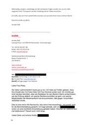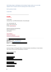 Gleichzeitig und ganz unabhängig von den komplexen Fragen würden wir uns als mabb insgesamt mehr Transparenz bei der Erstellung solcher Videos wünschen. Ich hoffe, dass wir Ihnen weiterhelfen konnten und wünsche Ihnen einen schönen Abend. Herzliche Grüße aus Berlin, Anneke Plaß ______________________________________________ Anneke Plaß Leitung Presse- und Öffentlichkeitsarbeit, Veranstaltungen Tel: +49 30 264 967 -80 Mobil: +49 170 570 44 39 E-Mail: plass@mabb.de Medienanstalt Berlin-Brandenburg Kleine Präsidentenstr. 1 10178 Berlin www.mabb.de twitter.com/mabb_de facebook.com/Medienanstalt.BB Von: Gesendet: Donnerstag, 6. Juni 2019 11:20 An: Anneke Plass <plass@mabb.de> Betreff: Anfrage wegen Frau Klöckner Liebe Frau Plass, Sie haben wahrscheinlich heute gut zu tun. Ich habe auf Twitter gelesen, dass Ihre Anstalt das YouTube-Video mit Frau Klöckner prüfen wird. Ich möchte gar nicht darüber berichten, aber als Redakteur für den Bereich Recht recherchieren, wie die Prüfung abläuft, um welche Rechtsvorschriften es geht, und welche Möglichkeiten die Medienaufsicht hat einzuschreiten, falls gegen Vorschriften verstoßen wurde. Dies ist eine reine Info-Recherche, also keine Interviewanfrage, und primär nicht für die Berichterstattung gedacht. Ich frage deshalb, weil uns schon um eine rechtliche Einschätzung gebeten haben. Könnten wir vielleicht kurz mal telefonieren? Dauert auch nicht lange Vielen Dank und schöne Grüße, 104