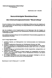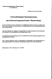Untersuchungsausschuss "Steuervollzug“ 12. Wahlperiode Saarbrücken, den 11.06.2003 Neunundvierzigster Beweisbeschluss des Untersuchungsausschusses "Steuervollzug“ Es soll im Hinblick auf eine umfassende und vollständige Aufklärung über eine mögliche poli- tische Einflussnahme bei Steuervollzug und Bürgschaftspraxis der Landesregierungen Be- weis erhoben werden über die Umstände um die Vorgehensweise bei den Beratungen über die Vergabe von Bürgschaften im Zusammenhang mit den Getriebewerken Rohrbach durch die saarländische Landesregierung sowie die Umstände des Steuervolizugs durch die saarländische Finanzverwaltung gegenüber den Getriebewerken Rohrbach durch Vorlage folgender Akten: 1. 2. 3. sämtlicher Berichte und Stellungnahmen des Insolvenzverwalters der Getriebewerke Rohrbach; sämtlicher saarländischer Steuerakten der Getriebewerke Rohrbach seit 1998; sämtlicher Vermerke der Finanzverwaltung und des Finanzministeriums in den steuer- lichen Angelegenheiten der Getriebewerke Rohrbach soweit nicht in den o.a. Steuerak- ten enthalten; sämtliche Anträge auf Landesbürgschaften mit allen eingereichten, nachgereichten und angeforderten Unterlagen; sämtliche Vermerke, Protokolle und Notizen bezogen auf Vorgespräche und Verhand- iungen zu den vorgenannten Anträgen mit den Getriebewerken Rohrbach, den Banken und anderen Beteiligten; die Vorlagen einschließlich der Tischvorlagen und sonstigen Unterlagen zu den ent- sprechenden Sitzungen der StS-Runde und des Ministerrates. Beschlossen in der 30. Sitzung am 11. Juni 2003