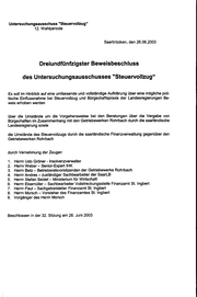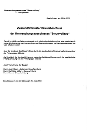 Untersuchungsausschuss "Steuervollzug“ 12. Wahlperiode Saarbrücken, den 26.06.2003 Zweiundfünfzigster Beweisbeschluss des Untersuchungsausschusses "Steuervollzug“ Es soll im Hinblick auf eine umfassende und vollständige Aufklärung über eine mögliche poli- tische Einflussnahme bei Steuervollzug und Bürgschaftspraxis der Landesregierungen Be- weis erhoben werden über die Umstände des Steuervollzugs durch die saarländische Finanzverwaltung gegenüber der Firmengruppe Michels, die Umstände der durchgeführten und geplanten Betriebsprüfungen durch die saarländische Finanzverwaltung bei der Firmengruppe Michels durch Vernehmung der Zeugen Herrn Axel Hübgen — Leiter der Steuerfahndung Herrn Karl Heinz Müller — Steuerfahndung Herrn Kennel - $teuerfahndung Beschlossen in der 32. Sitzung am 26. Juni 2003