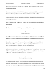Drucksache 12/965 Landtag des Saarlandes - 12. Wahlperiode - Ausweislich der notariellen Urkunde vom 11.04.1997, UR-Nr. 670/1997, wurden folgende Verträge abgeschlossen: Kooperationsvertrag vom 11.04.1997 (Vertragspartner Landeshauptstadt Saarbrücken, die Kreisstädte Homburg und Saarlouis, die Mittelstadt Völklingen und der KABV) Gesellschaftsvertrag der GKE Gesellschaft Kommunaler Entsorgungsbetriebe mit beschränk- ter Haftung, Saarbrücken A.S.S. GmbH, die ABW, die Kreisstadt Saarlouis, die Mittelstadt Völklingen und die Kreis- stadt Homburg Der Kooperationsvertrag enthielt folgende wesentliche Bestimmungen: "§ 1 Kooperationszweck (1) Die Kooperationspartner vereinbaren die partnerschaftliche und vertrauensvolle Zusam- menarbeit im Rahmen der Aufgabenerfüllung im Bereich der kommunalen Abfallwirtschaft. (2) Die Zusammenarbeit der Partner erstreckt sich nach Maßgabe noch abzuschließender Verträge, die im Rahmen der gesetzlichen oder satzungsmäßigen Erfordernissen noch von deren Beschlussgremien zu genehmigen sind, auf folgende Bereiche: a) Einsammeln und befördern von Abfällen zur Beseitigung und von Abfällen zur Verwertung, b) Sortierung, Aufbereitung, Verwertung und Vermarktung von Abfällen zur Verwertung (...) c) Recycling, Aufbereitung und Deponierung von Reststoffen, (...) §2 Umsetzung, Aufgabenzuteilung (1) Die Umsetzung der unter § 1 dieser Vereinbarung genannten Ziele erfolgt durch Grün- dung einer Gesellschaft mit beschränkter Haftung, an der die Kooperationspartner entweder selbst oder über die in Abs. 2 genannten Tochterunternehmen beteiligt sind. Die Gesellschaft 101