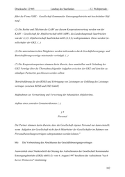 Drucksache 12/965 Landtag des Saarlandes - 12. Wahlperiode - führt die Firma 'GKE – Gesellschaft Kommunaler Entsorgungsbetriebe mit beschränkter Haf- tung'. (2) Die Rechte und Pflichten des KABV aus diesem Kooperationsvertrag werden von der KABV – Gesellschaft für Abfallwirtschaft mbH (ABW), die Landeshauptstadt Saarbrücken von der A.S.S. Abfallwirtschaft Saarbrücken mbH (A.S.S.) wahrgenommen. Diese werden Ge- sellschafter der GKE. (...) (3) Die unternehmerischen Tätigkeiten werden insbesondere durch Geschäftsbesorgungs- und Betriebsführungsverträge miteinander verknüpft. (...) (7) Die Kooperationspartner stimmen darin überein, dass unmittelbar nach Gründung der GKE Verträge über die Übernahme folgender Aufgaben zwischen der GKE und dem/den zu- ständigen Partner(n) geschlossen werden sollten: 'Betriebsführung für den BDSiS und Erbringung von Leistungen zur Erfüllung des Leistungs- vertrages zwischen BDSiS und DSD GmbH, Maßnahmen zur Vermarktung und Verwertung der behandelten Abfallströme, Aufbau eines zentralen Containerdienstes (...) §5 Personal Die Partner stimmen darin überein, dass die Gesellschaft eigenes Personal nur dann einstellt, wenn Aufgaben der Gesellschaft nicht durch Mitarbeiter der Gesellschafter im Rahmen von Personalbeistellungsverträgen wahrgenommen werden können." bb) Die Vorbereitung des Abschlusses des Geschäftsbesorgungsvertrages Ausweislich einer Niederschrift der Sitzung des Aufsichtsrates der Gesellschaft Kommunaler Entsorgungsbetriebe (GKE) mbH i.G. vom 6. August 1997 beschloss der Aufsichtsrat "nach kurzer Diskussion" einstimmig: 102