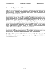 Drucksache 14/506 11. Landtag des Saarlandes - 14. Wahlperiode - Beendigung des Mietverhältnisses In § 4 des Mietvertrages zwischen dem Minister der Finanzen und der Gondwana Invest GbR vom 08.01.2007 ist vorgesehen, dass das Mietverhältnis auf Verlangen des Saarlandes um zwei mal vier Jahre zu verlängern ist, wobei die Miete nur noch auf die Unterhaltungs- und Bewirtschaftungskosten zu berechnen ist. Der Rechnungshof hat in seiner Prüfungsmitteilung festgestellt, dass im Mietvertrag ein Hin- weis darauf fehlt, dass das Saarland nach 25 Jahren die unentgeltliche und lastenfreie Über- tragung des Eigentums auf sich verlangen kann, wie es in der Rahmenvereinbarung zwischen dem Minister der Finanzen, dem Minister für Wirtschaft und Wissenschaft, der IKS und der Gondwana Invest GbR beschlossen worden war. Mit der obigen Regelung wird von der Rah- menvereinbarung abgewichen. Der Rechnungshof hat auf die Gefahr hingewiesen, dass der Anspruch auf Rückübertragung des Eigentums am Verwaltungsgebäude in 25 Jahren bei Aus- lauf des Mietverhältnisses in Vergessenheit gerät und nicht mehr realisiert wird. Im Übrigen hätte es der Rechnungshof für sinnvoll gehalten, statt eines fakultativen Eigentümerwechsels nach 25 Jahren einen entsprechenden Automatismus zu vereinbaren. Die Landesregierung hat in ihrer Stellungnahme angekündigt, dass sie den Hinweis des Rech- nungshofes auf die unentgeltliche und lastenfreie Übertragung des Eigentums aufgreifen wird. Auf die mögliche Verlängerung des Mietvertrages ist sie jedoch nicht eingegangen. Der Rechnungshof verweist darauf, dass sich wahrscheinlich erst in 25 Jahren zeigen wird, ob die Maßnahmen, die die Landesregierung jetzt noch ergreifen will, geeignet sind, Schaden vom Saarland abzuwenden. - 110 -