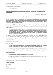 Drucksache 15/2108 Landtag des Saarlandes - 15. Wahlperiode - LANDTAG DES SAARLANDES 15. Wahlperiode Untersuchungsausschuss „Stiftung Saarländischer Kulturbesitz – Bau des IV. Muse- umspavillon“ 2. Beweisbeschluss Es soll im Hinblick auf eine umfassende und vollständige Aufklärung über die Verwendung von Landesmitteln sowie die Haushalts- und Wirtschaftsführung der Stiftung Saarländischer Kulturbesitz insbesondere die Ursachen der Kostenentwicklung beim Bau des IV. Muse- umspavillon Beweis erhoben werden durch Vorlage 1) sämtlicher Sitzungsprotokolle, Einladungen, Tisch- und sonstige Vorlagen des Kuratoriums der Stiftung Saarländischer Kulturbesitz seit 2002 2) aller Unterlagen, Akten, internen Vermerke, Gesprächsnotizen, Vorgänge und Korrespondenzen zwischen den jeweiligen Kuratoren, der Stiftung (jeweiliger Vorstand), der Landesregierung sowie ihren nachgeordneten Ministerien und Behörden 3) des gesamten Aktenbestandes und Schriftverkehrs zwischen den Ministe- rien untereinander sowie zwischen diesen und der Stiftung Saarländi- scher Kulturbesitz 4) sämtlicher Ministerratsvorlagen, die sich auf das Projekt des IV. Pavillon beziehen sowie damit in Zusammenhang stehende Vorbereitungen der beteiligten Ministerien und Landesdienststellen 5) des Sponsorenvertrages sowie sämtlicher Schriftverkehr, Vermerke und Notizen mit Herrn Edwin Kohl bzw. der Firma Kohlpharma (Kohl Medical AG) bezüglich des IV. Pavillon 6) aller vorliegenden und zu erwartenden Gutachten, Stellungnahmen und Bewertungen der Firma WPW bezüglich des IV. Museumspavillons 7) der zur Verfügungsstellung der erstellten Anonymisierungsliste des Rech- nungshofes zu den vorliegenden Berichten (PA II 1/VI-18-3-1 vom 10.06.2010; PA II /VI-18-3-1 vom 19.01.2011; PA IV 1/ XIX-2-3-10 vom 03.11.2011) - 106 -