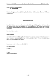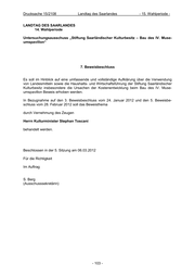 Drucksache 15/2108 Landtag des Saarlandes - 15. Wahlperiode - LANDTAG DES SAARLANDES 14. Wahlperiode Untersuchungsausschuss „Stiftung Saarländischer Kulturbesitz – Bau des IV. Muse- umspavillon“ 6. Beweisbeschluss Es soll im Hinblick auf eine umfassende und vollständige Aufklärung über die Verwendung von Landesmitteln sowie die Haushalts- und Wirtschaftsführung der Stiftung Saarländischer Kulturbesitz insbesondere die Ursachen der Kostenentwicklung beim Bau des IV. Muse- umspavillon Beweis erhoben werden durch Vorlage der Stellungnahmen der Stiftung Saarländischer Kulturbesitz, welche vom Rechnungshof in seiner Mitteilung über das Ergebnis der Prüfung vom 03.11.2011 (PA IV 1/XIX-2-3-10) bis zum 15.02.20120 angefordert wurden. Beschlossen in der 5. Sitzung am 06.03.2012 Für die Richtigkeit Im Auftrag S. Berg (Ausschusssekretärin) - 102 -