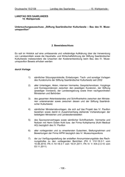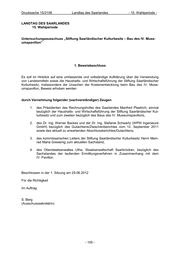 Drucksache 15/2108 Landtag des Saarlandes - 15. Wahlperiode - 8) der Buchungsunterlagen der Stiftung Saarländischer Kulturbesitz, die dem Rechnungshof bei der Erstellung seiner Berichte vorgelegen haben 9) die alten fehlerhaften Buchungsunterlagen/listen und Jahresabschlüsse seit 2002 10) die neuen, berichtigten Buchungsunterlagen/listen und Jahresabschlüsse seit 2002 11) sämtliche Unterlagen der Bauvorbereitung, Ausschreibung, Koordinierung und Auftragsvergabe in Bezug auf das Projekt des IV. Pavillon 12) sämtliche Anstellungsverträge mit Nebenabreden, sowie Änderungsver- träge (Ergänzungen, Erweiterungen) und Kündigungen gegenüber Herrn Ralph Melcher 13) sämtliche Anstellungsverträge mit Nebenabreden, sowie Änderungsver- träge (Ergänzungen, Erweiterungen) und Kündigungen gegenüber Herrn Gerd Marx 14) sämtlicher Satzungen der Stiftung Saarländischer Kulturbesitz 15) der neuen Satzung zum Entwurf eines Gesetzes über die Stiftung Saar- ländischer Kulturbesitz (Unterrichtung vom 23. November 2011 durch die Landesregierung) 16) ausführliches und umfassendes Organigramm/Geschäftsordnungs- verteilungsplan der Stiftung saarländischer Kulturbesitz 17) ausführliches und umfassendes Organigramm/Geschäftsordnungs- verteilungsplan der Teile der Landesregierung, die sich mit dem IV. Pavil- lon befasst haben Beschlossen in der 1. Sitzung am 29.06.2012 Für die Richtigkeit Im Auftrag S. Berg (Ausschusssekretärin) - 107 -