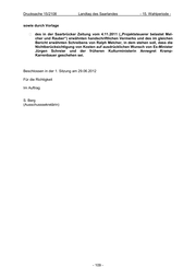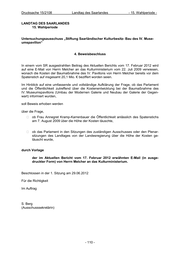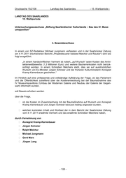 Drucksache 15/2108 Landtag des Saarlandes - 15. Wahlperiode - sowie durch Vorlage des in der Saarbrücker Zeitung vom 4.11.2011 („Projektsteuerer belastet Mel- cher und Rauber“) erwähnten handschriftlichen Vermerks und des im gleichen Bericht erwähnten Schreibens von Ralph Melcher, in dem stehen soll, dass die Nichtberücksichtigung von Kosten auf ausdrücklichen Wunsch von Ex-Minister Jürgen Schreier und der früheren Kulturministerin Annegret Kramp- Karrenbauer geschehen sei. Beschlossen in der 1. Sitzung am 29.06.2012 Für die Richtigkeit Im Auftrag S. Berg (Ausschusssekretärin) - 109 -