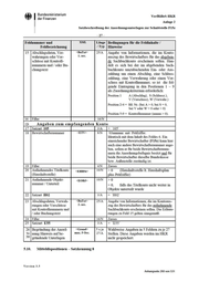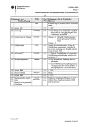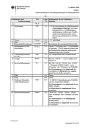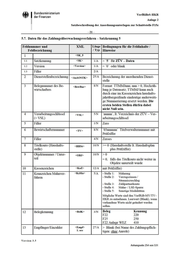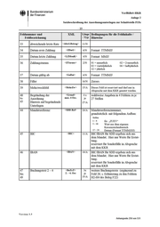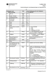 • Bundesministerium der Finanzen VerfRiBeS-HKR Anlage 2 Satzbeschreibung der Anordnungsunterlagen zur Schnittstelle F15z -22- Feldnummer und Feldbezeichnung XML L äng(' Bedingungen für die Feldinhalte I / T yp Hinweise 14 Wie vor <Empf> 2. occ 27/A 15 Straße I Postfach <StrPf> 27/A 16 Länderkennzeichen <LKZ> 3/A 17 Postleitzahl <PLZ> 5/A Ottsangabe <Ort> 22/A 18 Filler <BLZ> 8/N 19 Filler <KtoNr> 10/N 20 Filler <Institut> 27/A 21 Kennzeichen Lastschrif- teinzug <KzLSE> 1/A 0 = kein LSEISDD 1 = LSE S = SDD 9 = Aufhebung LSEISDD 22 Be t r a g <Betrag> 13/N >= 0 (Bei Belegkennung 410 siehe Hinweis zu Feld 31 = Teilbetrag) 23 Fälligkeit <FaeDat> 6/N > 0 (TTMMJJ) = Tag der Fälligkeit der Einzahlung 24 Bezugsbelegnummer I Buchungsplatz 1 <BezBnr> 8/N Eintrag Bezugsbelegnummer oder Buchungsplatz 1 25 Buchungsplatz 2 <BuPI> 6/N 26 Filler 27 Vetwendtmgszweck auf dem Übetweistmgs- oder Lastschriftträger <ZaWT:xt> 27/A Angaben zum Zweck der Zahlung 28 Buchungstext <BuT:xt> 1. occ. 25/A Angabe von Inf01mationen, die im Kon- toauszug des Bewiit schafters erscheinen sollen. Soll auf einen Vorschuss Bezug ge- nommen werden, so ist die folgende Eintragung in den Positionen 1 - 9 er- forderlich: Pos. 1 V (Vorschuss) Pos. 2-4 laufende Nummer Pos. 5-9 Kontrollnummer (nnnnn > 0). 29 abweichender Einzahler <Ktolnhaber> 25/A vom Einzahlungspflichtigen abweichen- der Einzahler 30 Ordnungsnummer <OrdNr > 2/N Bei VSL 013 01 >= '01 ', ansonsten = '00' 31 Teilbetrag <Teilbetrag> ll/N bei Buchungen zu Belegkennung 410 ist der Teilbetrag auch in Feld 22 einzutra- gen <AbwEBetrag> ll/N 32 abweichende erste Rate 12/A Ver s ion 3.5 Anhangseite 255 von 531