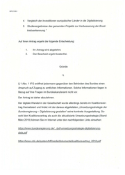 SEITE 2 VON 3 4. Vergleich der Investitionen europäischer Länderin die Digitalisierung, 5. Studienergebnisse des genannten Projekts zur Verbesserung der Brust- krebserkennung.“ Auf Ihren Antrag ergeht die folgende Entscheidung: 1. Ihr Antrag wird abgelehnt. 2, Der Bescheid ergeht kostenfrei. Gründe 8 1 Abs. 1 IFG eröffnet jedermann gegenüber den Behörden des Bundeseinen Anspruch auf Zugang zu amtlichen Informationen. Solche Informationen liegen in Bezug aufIhre Fragen im Bundeskanzleramt nicht vor. Der Antrag ist daher abzulehnen. Der digitale Wandel in der Gesellschaft wurde allerdings bereits im Koalitionsver- trag thematisiert und findet mit der daraus abgeleiteten „Umsetzungsstrategie der Bundesregierung — Digitalisierung gestalten“ seine konkrete Ausgestaltung. So- wohl den Koalitionsvertrag als auch die aktualisierte Umsetzungsstrategie (Stand: März 2019) können Sie im Internet unter den nachfolgenden Links einsehen: https:/www.bundesregierung.de/.../pdf-umsetzungsstrategie-digitalisierung- data.pdf https:/www.cdu.de/system/tdf/media/dokumente/koalitionsvertrag_2018.pdf