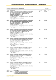 Bundeseinheitlicher Tatbestandskatalog - Tatbestände Achslast und Gesamtgewicht - § 34 StVZO Seite 304/ 0 TBNR Tatbestandstext FaP-Pkt Euro FV 334837 Sie führten als Halter die kennzeichnungspflichtige Fahrzeugkombina- B -1 570,00 tion mit gefährlichen Gütern, obwohl das zulässige Gesamtgewicht um ...,.. (mehr als 20) Prozent = ...... kg überschritten war. Festgestelltes Gesamtgewicht: *)...... kg. Zulässiges Gesamtgewicht: **)...... kg. § 34 Abs. 3, § 31d Abs. 1 ***), § 69a StVZO; § 24 StVG; 198.1.5 BKat; § 3 Abs. 2, 4 BKatV (Fahrzeugkombination über 7,5 t m. gef. Gütern) Tab.: 734081 334838 Sie führten als Halter die kennzeichnungspflichtige Fahrzeugkombina- B -1 637,50 tion mit gefährlichen Gütern, obwohl das zulässige Gesamtgewicht um ...,.. (mehr als 25) Prozent = ...... kg überschritten war. Festgestelltes Gesamtgewicht: *)...... kg. Zulässiges Gesamtgewicht: **)...... kg. § 34 Abs. 3, § 31d Abs. 1 ***). § 69a StVZO; § 24 StVG; 198.1.6 BKat; § 3 Abs. 2, 4 BKatV (Fahrzeugkombination über 7,5 t m. gef. Gütern) Tab.: 734081 334839 Sie führten als Halter die kennzeichnungspflichtige Fahrzeugkombina- B -1 637,50 tion mit gefährlichen Gütern, obwohl das zulässige Gesamtgewicht um ...,.. (mehr als 30) Prozent = ...... kg überschritten war. Festgestelltes Gesamtgewicht: *)...... kg. Zulässiges Gesamtgewicht: **)...... kg. § 34 Abs. 3, § 31d Abs. 1 ***), § 69a StVZO; § 24 StVG; 198.1.7 BKat; § 3 Abs. 2, 4 BKatV (Fahrzeugkombination über 7,5 t m. gef. Gütern) Tab.: 734081 334340 Sie führten als Halter die Fahrzeugkombination, obwohl die zulässige (B - 0) 30,00 Achslast um ...,.. (2 - 5) Prozent = ...... kg überschritten war. Festgestellte Achslast: *)...... kg. Zulässige Achslast: **)...... kg. § 34 Abs. 3, § 31d Abs. 1 ***), § 69a StVZO; § 24 StVG; 198.1.1 BKat; (Fahrzeugkombination über 7,5 t) Tab.: 734082 334840 Sie führten als Halter die Fahrzeugkombination, obwohl die zulässige B -1 140,00 Achslast um ...,.. (mehr als 5) Prozent = ...... kg überschritten war. Festgestellte Achslast: *)...... kg. Zulässige Achslast: **)...... kg. § 34 Abs. 3, § 31d Abs. 1 ***), § 69a StVZO; § 24 StVG; 198.1.2 BKat; § 3 Abs. 2 BKatV (Fahrzeugkombination über 7,5 t) Tab.: 734082 334841 Sie führten als Halter die Fahrzeugkombination, obwohl die zulässige B -1 235,00 Achslast um ...,.. (mehr als 10) Prozent = ...... kg überschritten war. Festgestellte Achslast: *)...... kg. Zulässige Achslast: **)...... kg. § 34 Abs. 3, § 31d Abs. 1 ***), § 69a StVZO; § 24 StVG; 198.1.3 BKat; § 3 Abs. 2 BKatV (Fahrzeugkombination über 7,5 t) Tab.: 734082 334842 Sie führten als Halter die Fahrzeugkombination, obwohl die zulässige B -1 285,00 Achslast um ...,.. (mehr als 15) Prozent = ...... kg überschritten war. Festgestellte Achslast: *)...... kg. Zulässige Achslast: **)...... kg. § 34 Abs. 3, § 31d Abs. 1 ***), § 69a StVZO; § 24 StVG; 198.1.4 BKat; § 3 Abs. 2 BKatV (Fahrzeugkombination über 7,5 t) Tab.: 734082 TBNR Bemerkungen 334837 - 334839 *) Festgestelltes Gesamtgewicht angeben **) Zulässiges Gesamtgewicht angeben ***) Zutreffende Rechtsgrundlage angeben Stand: 1. Mai 2014