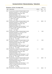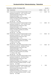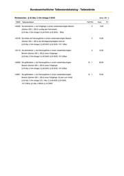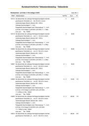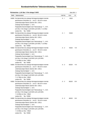 Bundeseinheitlicher Tatbestandskatalog - Tatbestände Richtzeichen - § 42 Abs. 2 iVm Anlage 3 StVO Seite 202/ 0 TBNR Tatbestandstext FaP-Pkt Euro FV 142621 Sie überschritten die zulässige Höchstgeschwindigkeit innerhalb A -2 360,00 2M geschlossener Ortschaften um ... (von 31 - 40) km/h in einem verkehrsberuhigten Bereich (Zeichen 325.1, 325.2). Zulässige Geschwindigkeit: *)... km/h. Festgestellte Geschwindigkeit (nach Toleranzabzug): **)... km/h. § 42 Abs. 2 iVm Anlage 3, § 49 StVO; § 24, § 25 StVG; 11.2.7 BKat; § 4 Abs. 1 BKatV (gef. Güter usw.) Tab.: 742001 142622 Sie überschritten die zulässige Höchstgeschwindigkeit innerhalb A -2 480,00 3M geschlossener Ortschaften um ... (von 41 - 50) km/h in einem verkehrsberuhigten Bereich (Zeichen 325.1, 325.2). Zulässige Geschwindigkeit: *)... km/h. Festgestellte Geschwindigkeit (nach Toleranzabzug): **)... km/h. § 42 Abs. 2 iVm Anlage 3, § 49 StVO; § 24, § 25 StVG; 11.2.8 BKat; § 4 Abs. 1 BKatV (gef. Güter usw.) Tab.: 742001 142623 Sie überschritten die zulässige Höchstgeschwindigkeit innerhalb A -2 600,00 3M geschlossener Ortschaften um ... (von 51 - 60) km/h in einem verkehrsberuhigten Bereich (Zeichen 325.1, 325.2). Zulässige Geschwindigkeit: *)... km/h. Festgestellte Geschwindigkeit (nach Toleranzabzug): **)... km/h. § 42 Abs. 2 iVm Anlage 3, § 49 StVO; § 24, § 25 StVG; 11.2.9 BKat; § 4 Abs. 1 BKatV (gef. Güter usw.) Tab.: 742001 142624 Sie überschritten die zulässige Höchstgeschwindigkeit innerhalb A -2 760,00 3M geschlossener Ortschaften um ... (über 60) km/h in einem verkehrsberuhigten Bereich (Zeichen 325.1, 325.2). Zulässige Geschwindigkeit: *)... km/h. Festgestellte Geschwindigkeit (nach Toleranzabzug): **)... km/h. § 42 Abs. 2 iVm Anlage 3, § 49 StVO; § 24, § 25 StVG; 11.2.10 BKat; § 4 Abs. 1 BKatV (gef. Güter usw.) Tab.: 742001 142130 Sie überschritten die zulässige Höchstgeschwindigkeit innerhalb 0 15,00 geschlossener Ortschaften um ... (bis 10) km/h in einem verkehrsberuhigten Bereich (Zeichen 325.1, 325.2). Zulässige Geschwindigkeit: *)... km/h. Festgestellte Geschwindigkeit (nach Toleranzabzug): **)... km/h. § 42 Abs. 2 iVm Anlage 3, § 49 StVO; § 24 StVG; 11.3.1 BKat (andere Kfz) Tab.: 742002 142131 Sie überschritten die zulässige Höchstgeschwindigkeit innerhalb 0 25,00 geschlossener Ortschaften um ... (von 11 - 15) km/h in einem verkehrsberuhigten Bereich (Zeichen 325.1, 325.2). Zulässige Geschwindigkeit: *)... km/h. Festgestellte Geschwindigkeit (nach Toleranzabzug): **)... km/h. § 42 Abs. 2 iVm Anlage 3, § 49 StVO; § 24 StVG; 11.3.2 BKat (andere Kfz) Tab.: 742002
