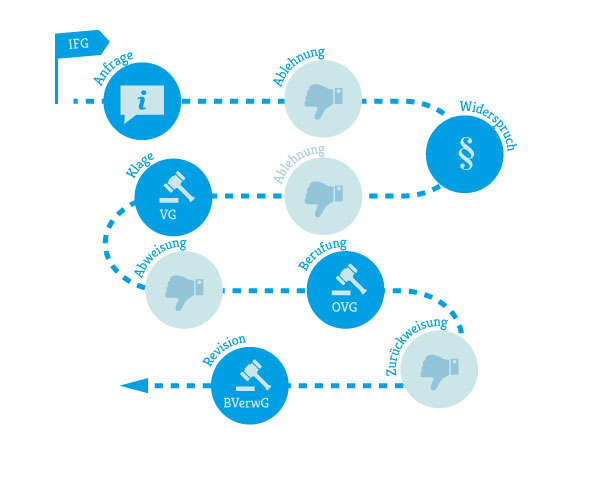 Gegen die Ablehnung eines Widerspruchs lässt sich innerhalb eines Monats Klage vor dem für die Behörde zuständigen Verwaltungsgericht erheben. Auch wenn die Behörde drei Monate lang nicht reagiert, ist ohne vorherigen Widerspruch eine Untätigkeitsklage möglich. Parallel zu Widersprüchen können auch der Bundes- oder die zuständigen Landesbeauftragten für Informationsfreiheit kostenfrei um Vermittlung gebeten werden.